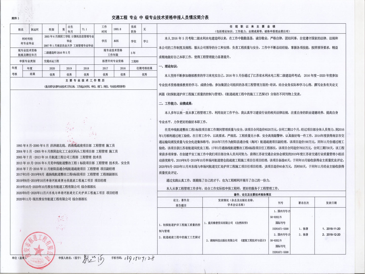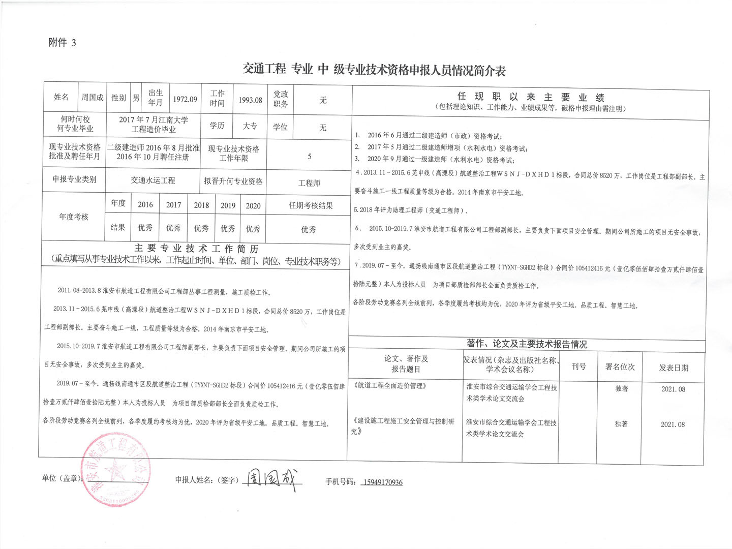 關(guān)于周?chē)?guó)成等同志申報(bào)交通工程類(lèi)水運(yùn)工程專(zhuān)業(yè)中級(jí)工程師的公示